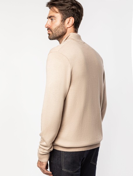Бежевый джемпер с длинными рукавами выполнен из мягкой хлопковой пряжи с добавлением акрила. Высокий воротник застегивается молнией. За счет переплетения светлых и темных нитей получилась фактурная меланжевая модель, которая, отлично держит тепло и почти не ощущается на теле. Сочетается с футболками, денимом и с чиносами, любой обувью.
