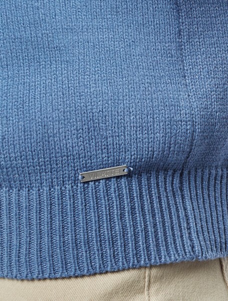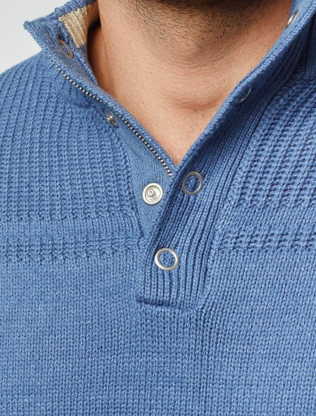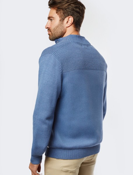 Свитер фактурной вязки с застежкой на крупные кнопки выполнен из мягкой хлопковой пряжи с добавлением акрила. Модель из такого материала не препятствует циркуляции воздуха, но при этом хорошо сохраняет тепло и не колется, поэтому ее комфортно носить на голое тело. С помощью кнопок можно регулировать высоту воротника и носить свитер по-разному. Внизу изделия нашивка бренда из эко-кожи.