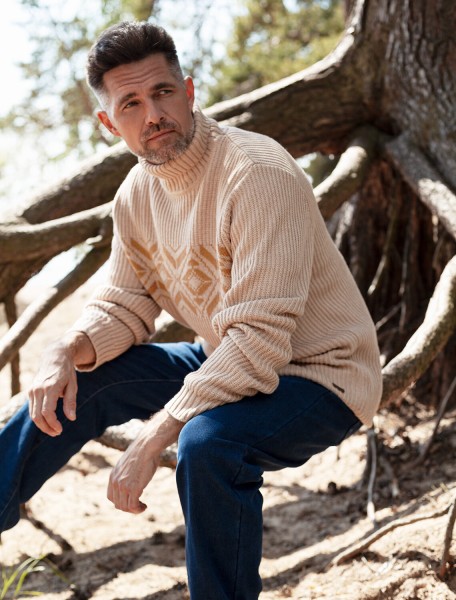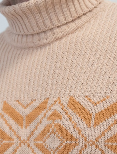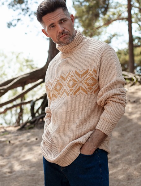 Свитер крупной фактурной вязки выполнен из мягкой хлопковой пряжи с акрилом. Теплая фактура изделия подчеркнута скандинавским узором. Длинный ворот защитит от ветреной погоды и поможет собрать, уютный комплект в расслабленном стиле в осенне-зимний период. Не препятствует циркуляции воздуха, но при этом хорошо сохраняет тепло и не колется, поэтому свитер комфортно носить даже на голое тело. Модель дополнена фирменным логотипом бренда.