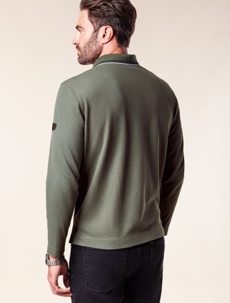 Поло прямого силуэта выполнено из фактурного трикотажа. Плетеный ворот с застежкой планкой на металлической молнии украшен контрастной полоской. Эластичный хлопковый материал хорошо пропускает воздух, а одежда из него не пилингуется и комфортно облегает фигуру. Однотонная модель с длинными рукавами дополнена небольшим вышитым логотипом бренда.