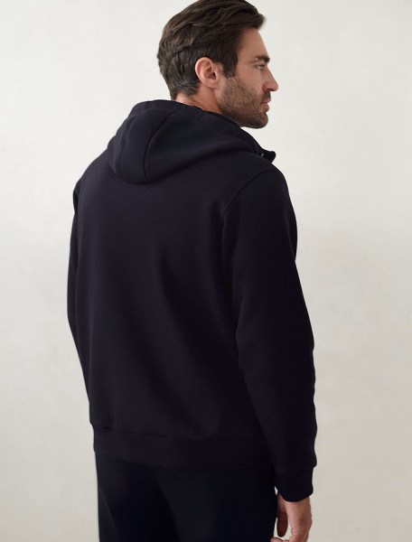 Худи на молнии выполнено из премиального эластичного футера трехнитки с теплым начесом. Модель с капюшоном и воротом стойка дополнена боковыми карманами и нашивкой с логотипом бренда из эко-кожи. Ранней осенью или поздней весной можно носить в качестве верхней одежды. Высококачественная фурнитура цвета темное серебро. Изделие сочетается в костюме с брюками U44.006