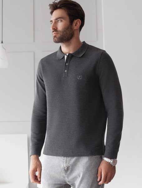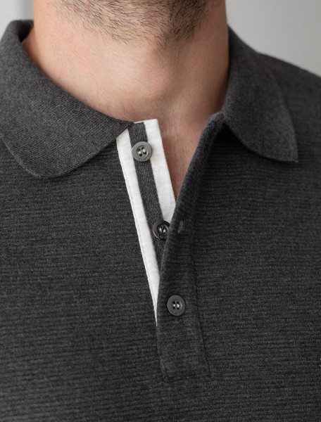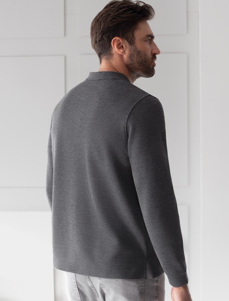 Стильный лонгслив темно-серого цвета с эффектом меланж с плетеным воротником поло с застежкой на металлические пуговицы выполнен из премиального хлопка в сочетании с эластаном . Невероятно мягкая ткань из натуральных волокон - она едва ощутима на коже и словно обнимает тело. Материал при касании кажется бархатистым, при движении он словно повторяет все мельчайшие линии фигуры. По свойствам материал сочетает в себе практичность и нежность: отлично провускает воздух, сохраняя ощущение свежести в течение всего дня, при этом созраняет тепло в прохладную погоду.Идеально подходит для чувствительной кожи, не вызывает раздражения и дискомфорта. Удобный отложной воротник с контрастной отделкой делает образ современным и стильным, а длинные рукава с манжетами защищают руки при ветреной погоде.