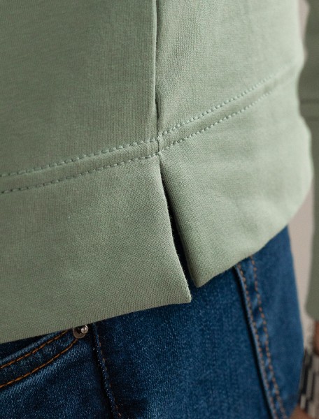 Лонгслив с пуговицами дополнен небольшими разрезами по бокам и ненавязчивой вышивкой в виде надписи в тон основному цвету, которые придают образу индивидуальность, не перегружая его лишними акцентами. Лаконичная вышивка служит оригинальным декоративным элементом, гармонично вписываясь в общий минималистичный облик. Такой подход делает лонг универсальным решением для тех, кто цен