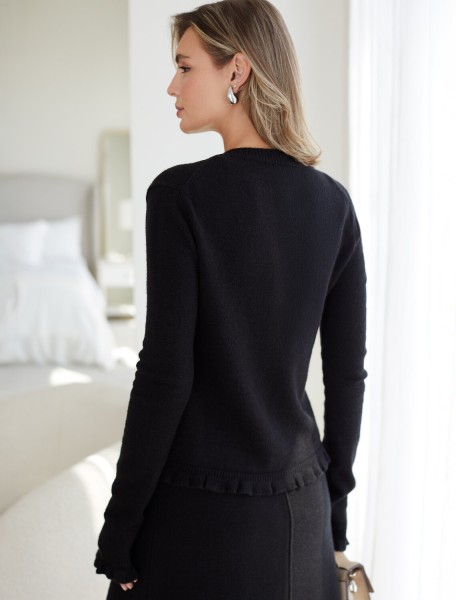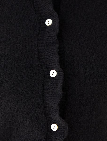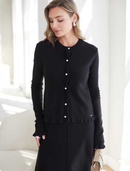 Кардиган выполнен из мягкой пряжи с Романтичности прямому силуэту добавляют мягкие воланы по линии пуговиц, на манжетах и краю изделия. Застежка на пуговицы из натурального перламутра. Изделие очень приятное к телу, совершенно не колется и отлично сохраняет тепло. Сочетается в костюме с брюками D38.013, D38.012 и юбкой D36.016
