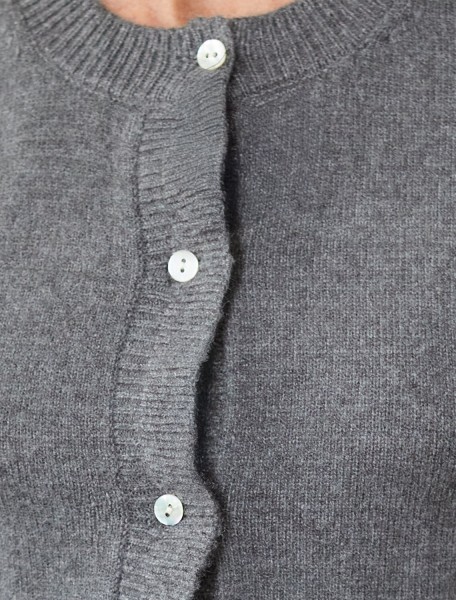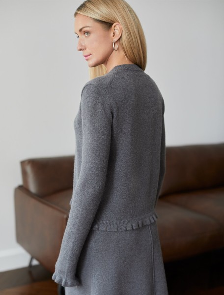 Кардиган выполнен из мягкой меланжевой пряжи с Романтичности прямому силуэту добавляют мягкие воланы по линии пуговиц, на манжетах и краю изделия. Застежка на пуговицы из натурального перламутра. Изделие очень приятное к телу, совершенно не колется и отлично сохраняет тепло. Сочетается в костюме с брюками D38.013, D38.012 и юбкой D36.016