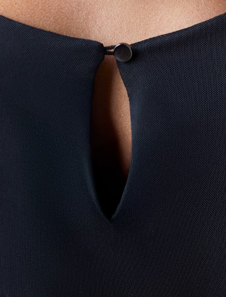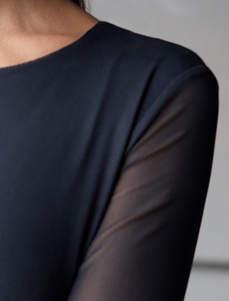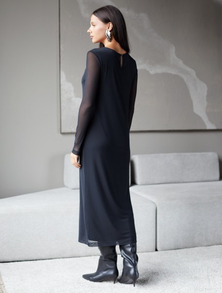 Элегантное платье прямого кроя черного цвета выполнено из воздушной сетчатой ткани с прозрачными рукавами, придающими образу лёгкую игривость. Мягкая вискозная подкладка обеспечивает комфорт, сохраняя при этом эффект полупрозрачности. Универсальный черный цвет делает платье идеальным для базового гардероба.