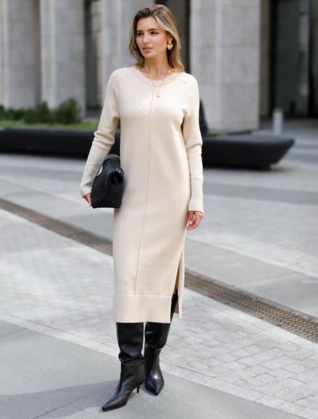 Платье длины миди выполнено из мягкой меланжевой пряжи с кашемиром. Модель прямого силуэта дополнена одиночным высоким боковым разрезом. Вязаный кант вертикально проходящий по всему изделию, визуально стройнит и вытягивает силуэт. При желании можно подчеркнуть линию талии, используя контрастный пояс.