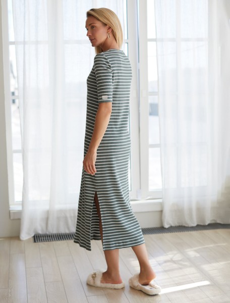 Платье длины миди из мягкого трикотажа выполнено широкий рубчик. Благодаря добавлению эластана материал обладает высокой формоустойчивостью, что обеспечивает комфорт при носке и сохранение первоначального вида после длительного использования. Полуприлегающая посадка подчеркивает фигуру, а длина рукава до локтя делает модель универсальной для любого времени года. Разрезы по бокам добавляют изящности и свободы движений, делая образ женственным и утонченным. Платье станет отличным выбором для создания разнообразных образов — от классического до повседневного стиля. Оно легко комбинируется с аксессуарами и обувью, позволяя вам экспериментировать с модными решениями.